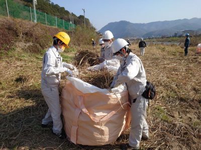 岡山県建設業界高梁支部の皆さんと共に、復興グループ事業の一環として、ききょうグランド近辺の河川敷を清掃しました。