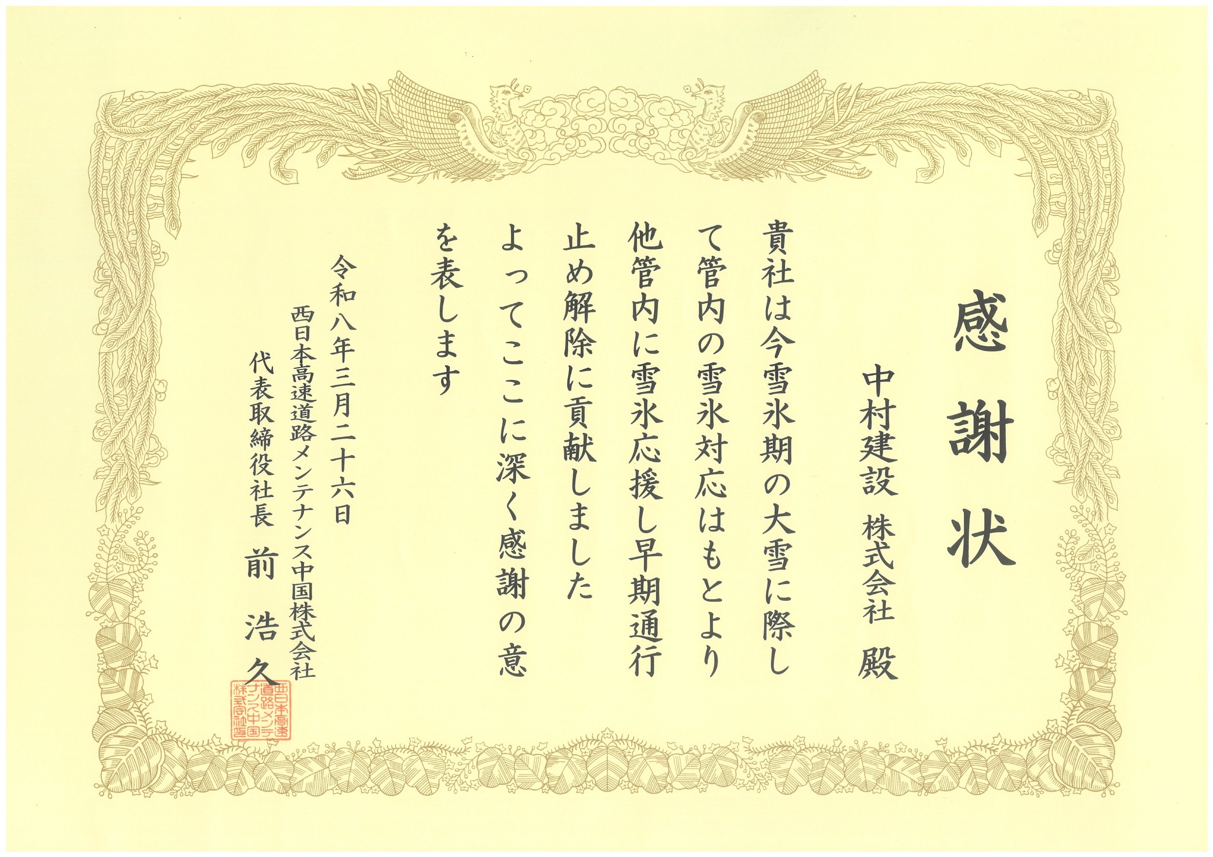 西日本高速道路メンテナンス中国 株式会社 様より他管内への雪氷応援対応について、感謝状をいただきました。